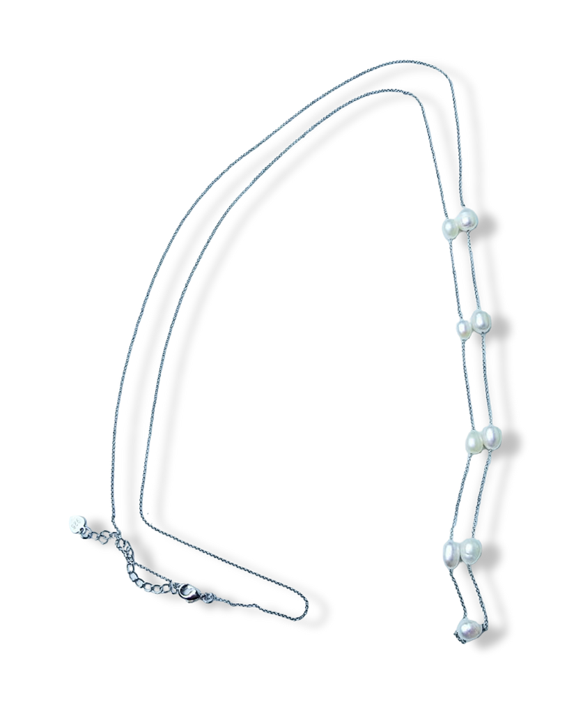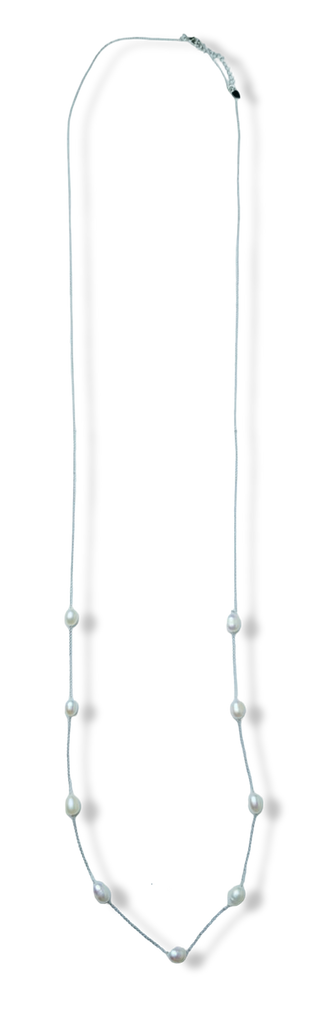 COLLAR PERLA ARROZ BLANCO Y CADENA LARGA PLATEADO
