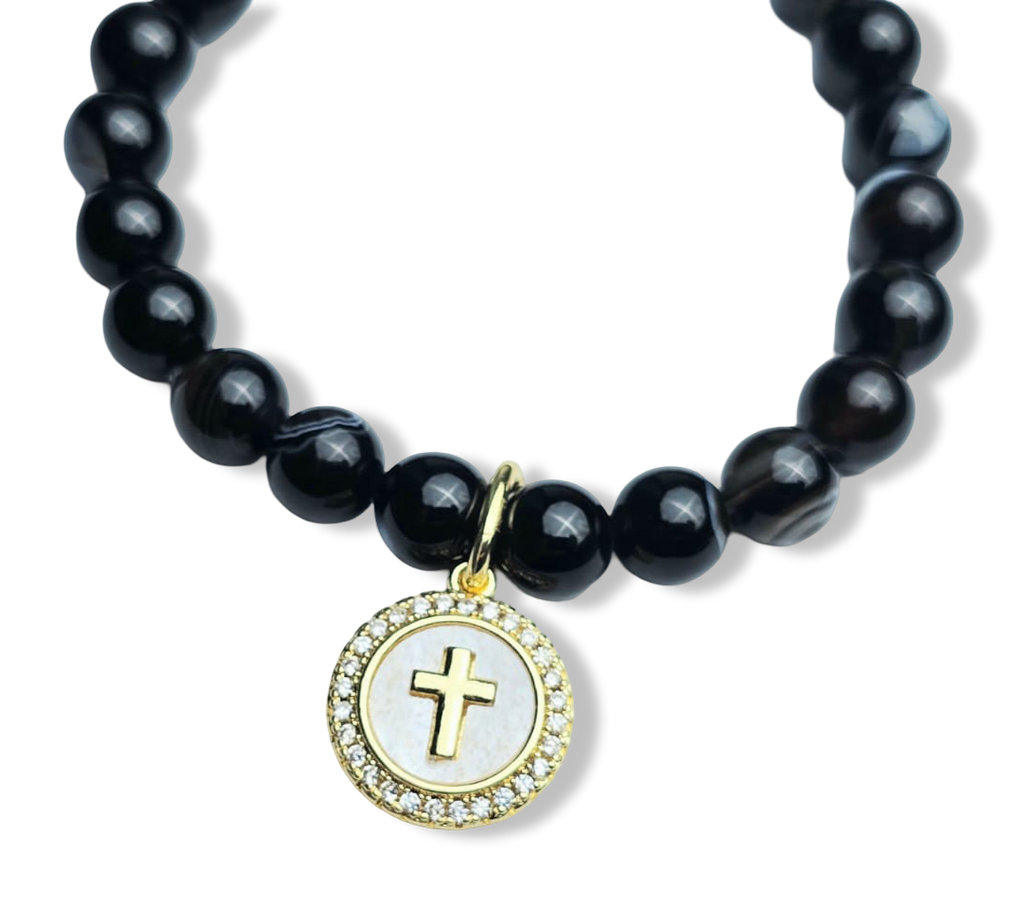 PULSERA MADRE PERLA CRUZ ÁGATA NEGRA DORADO